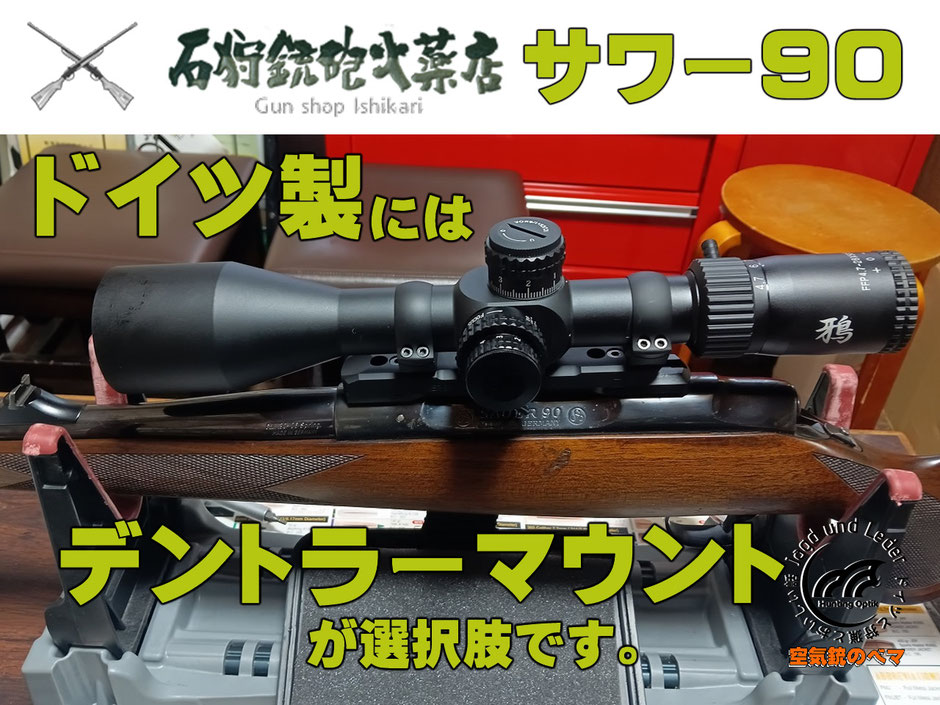 このたび、北海道札幌市に拠点を構える石狩銃砲火薬店(外部リンク)さまにおきまして、ドイツ製のスコープマウント、デントラーのお取扱いを戴けることになりました。今回、デントラーをご採用いただいたライフル銃はサワー90。スコープはトウキョウジュウホウ様お取扱いの30㎜径FFPスコープ、鴉 4.7-28x50 です。それではサワー90用のデントラーベースレールを少し見て参ります。
